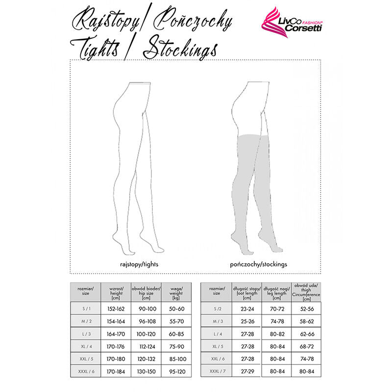 Die einzigartigen Strümpfe von LivCo Corsetti wurden für emanzipierte, selbstbewusste Frauen kreiert, die ihren Sexappeal nicht scheuen. Strümpfe sind ein Element der Damengarderobe, das die Herzen vieler Frauen und anderer erobert hat. Sie betonen auf wunderschöne Weise die Schönheit weiblicher Beine und sind gleichzeitig sexy und erregen die Sinne. Das Modell ist eine Kombination aus Spitzengürtel und Strümpfen, die perfekt zu anderen Elementen erotischer Dessous passen. Unterwäsche für besondere Anlässe sowie für den Alltag. Spitze am Oberschenkel wird die Aufmerksamkeit auf die Beine lenken. Dies sind einzigartige Strümpfe, die im Handumdrehen eine sinnliche Überraschung offenbaren. Ein Unterwäschemodell für echte Verführerinnen, die auffallen möchten. Die Strümpfe sind aus hochwertigem, strapazierfähigem Material gefertigt, sodass sie lange halten. Erhältlich in den Größen SL