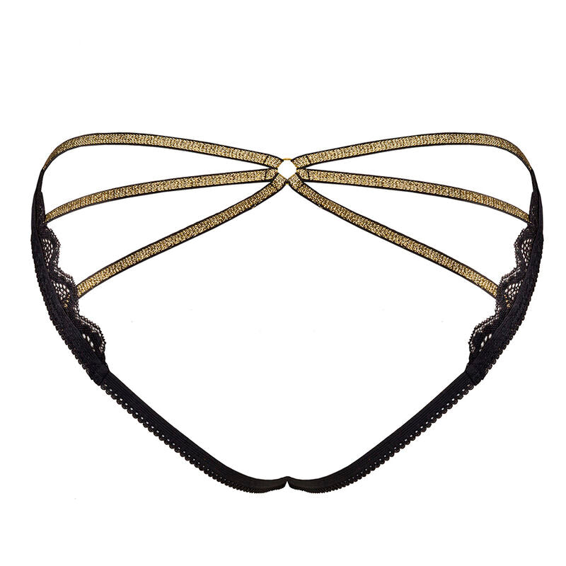 Einzigartige und außergewöhnliche schwarze Höschen verkörpern Weiblichkeit, Sexappeal und Sinnlichkeit. Die unauffällige Rückseite, eine Kombination aus dezenter Spitzenverzierung und ausdrucksstarken Trägern, die das Gesäß betonen und betonen, verleiht diesem Modell Charakter und unterscheidet es von anderen klassischen Optionen. Panty Muled ist außerdem eine Balance zwischen der Zartheit der Spitze und ihrem dunklen Schwarzton, der teilweise durch glänzende Streifen unterbrochen wird.